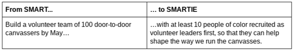 For example, the Building Movement Project, a non-profit consulting firm devoted to helping organizations become more equitable and fostering social change through movement building, found that people of color in the nonprofit sector often encounter structural barriers that make it more difficult to reach leadership roles. SMARTIE goals could directly address the structural barriers by specifying the aim to change the barrier and see that change directly in the people who have been caught up by that barrier.
